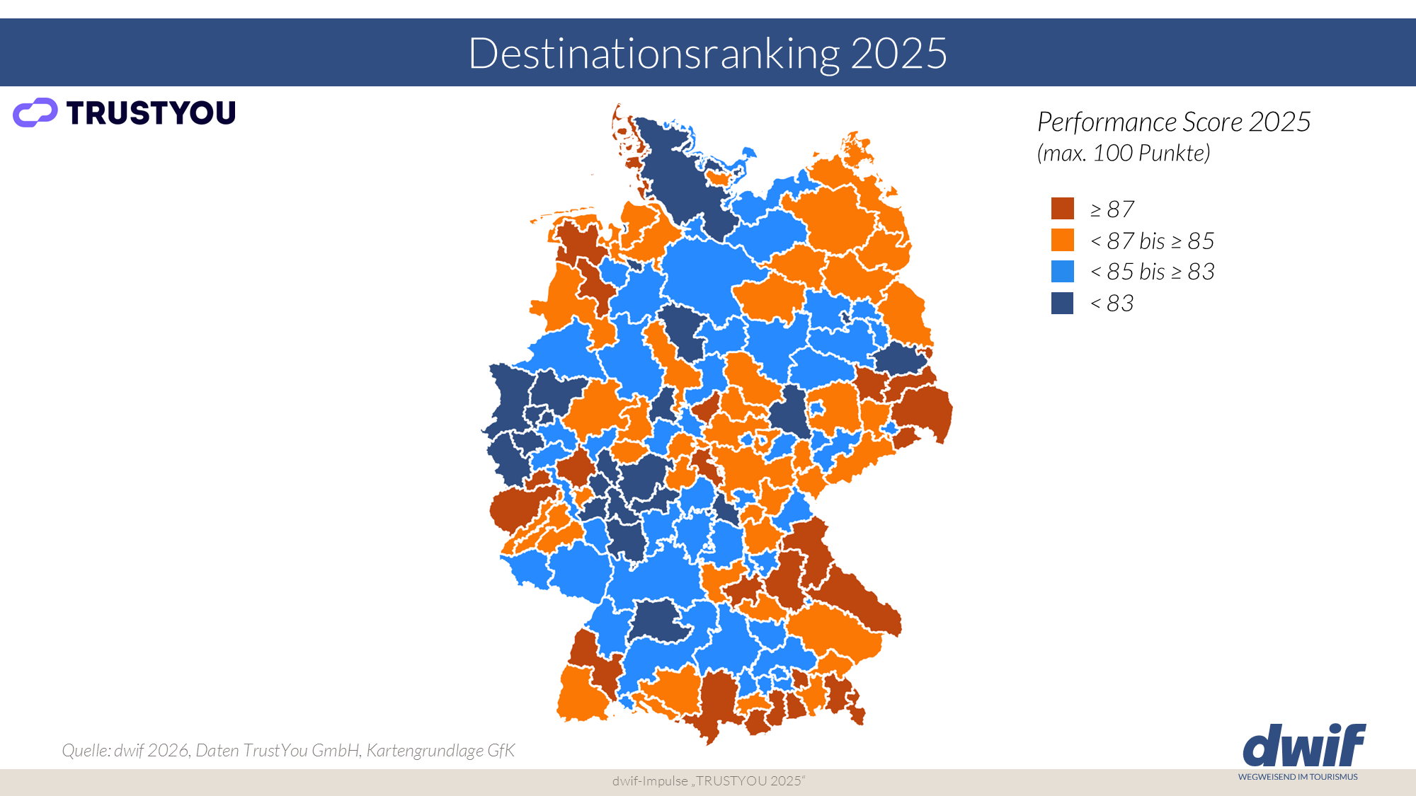 Gemeinsam mit ihrem Partner TrustYou veröffentlicht die Tourismusberatung dwif bereits seit 2010 das jährliche dwif & TrustYou Destinations-Ranking für über 140 Regionen im Deutschland-Tourismus. Die Auswertungen geben Aufschluss darüber, wie sich die Qualität der Unterkünfte aus Sicht der Gäste entwickelt hat. Sentiment Analysen zeigen zudem detailliert die Verbesserungspotenziale im Beherbergungsgewerbe der jeweiligen Destination.